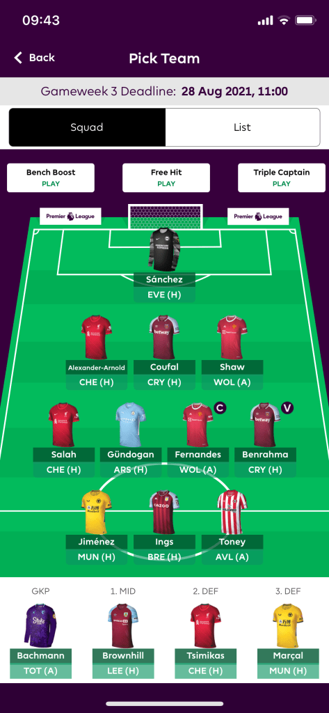 I’ve struggled to think of much to do with my free transfers this week as while there were players I wanted to get rid of, I wasn’t certain of who I’d want to replace them. So one transfer for me this week, White out for Marcal.